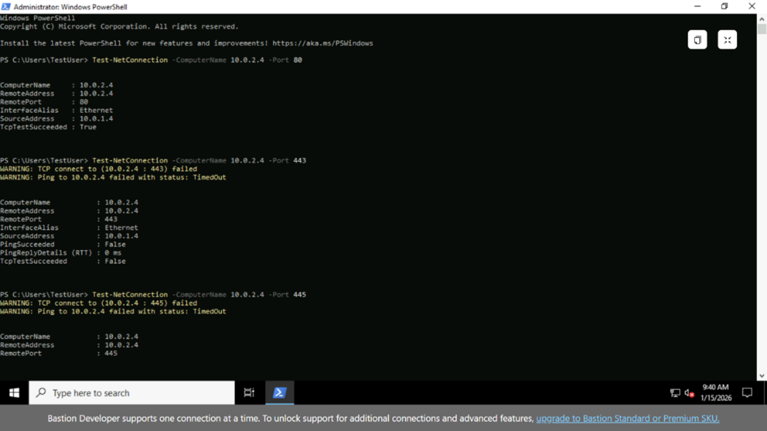 vm-app から vm-blocked のプライベートIP宛に、PowerShell の Test-NetConnection を用いて疎通確認を行いました。