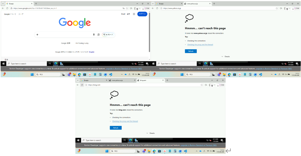 Microsoft Edge を用いて外部サイトへアクセスし、Firewall のアプリケーション規則がどのように反映されるか検証しました。