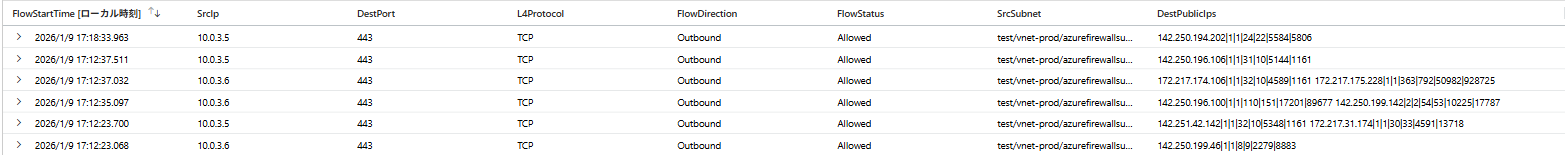 なお、Firewallの詳細なルール名はVNetフローログでは取得できないため、Firewallのログと併用することでより正確な分析が可能です。