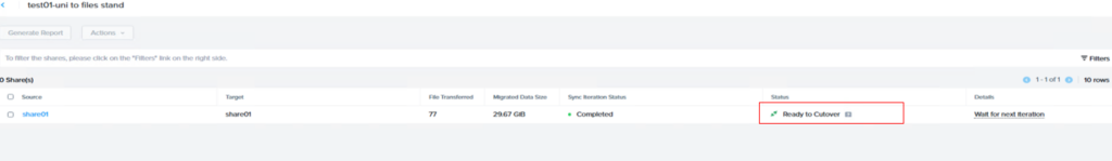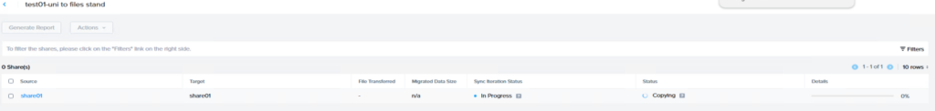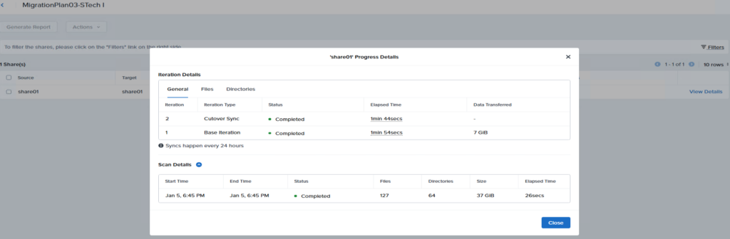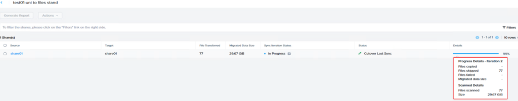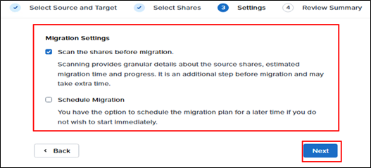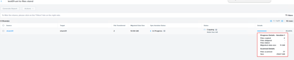 移行前にソース共有をスキャンし、詳細情報、推定所要時間、進捗状況を表示します。