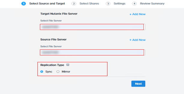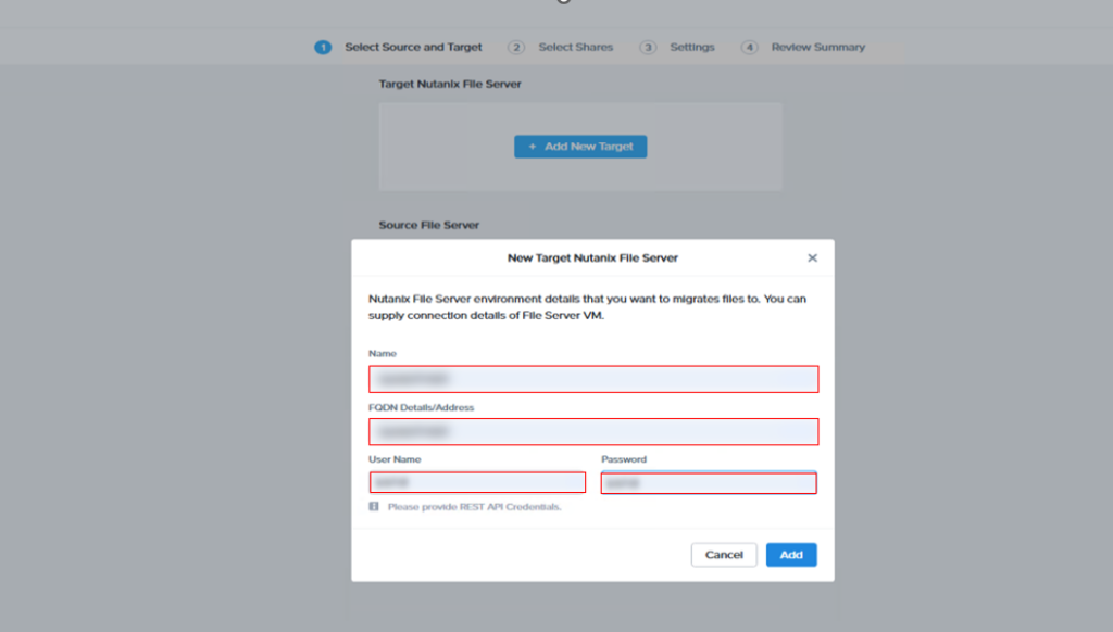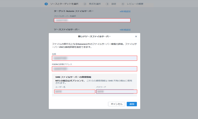 次に【①Select Source and Target】セクションで、移行元となるNASストレージの情報を登録します。