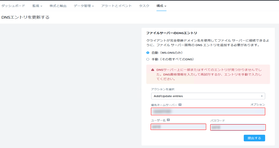 ファイルサーバのDNSレコードが追加されない場合、以下ドキュメントを参照ください。