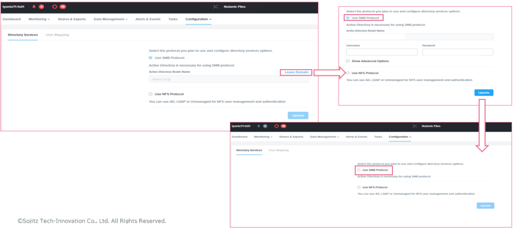 Filesコンソール>Configuration > Authentication>Directory Services タブよりドメインを入力し再参加させます。
