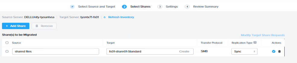 【②Select Shares】セクションにて、「Add Share」をクリックし「移行元の共有フォルダ」 と「移行先の共有フォルダ」を登録します。利用プロトコルやReplication Typeもあわせて設定します。