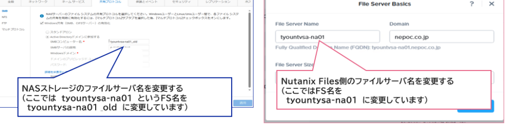 そのため、Filesを一度ドメインから離脱させた上で、ファイルサーバ名を既存と同じ名称に変更し、再度ドメイン参加させるという手法で同一アクセスパスでの切り替えが可能となります。