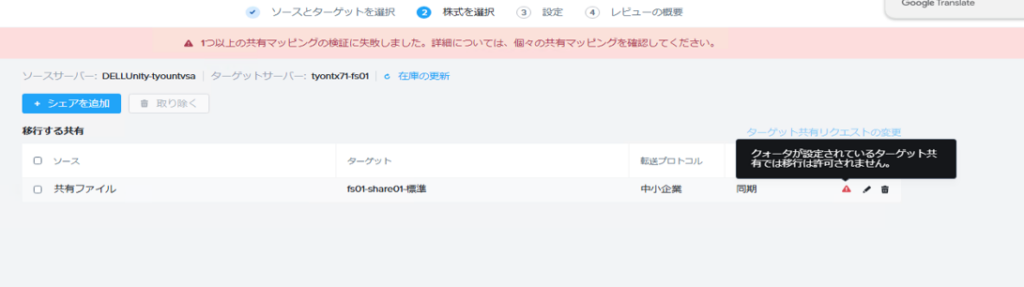 Files 側の共有フォルダに クオータ設定や Smart DR 設定 が有効になっていると、移行開始時にエラーとなります。