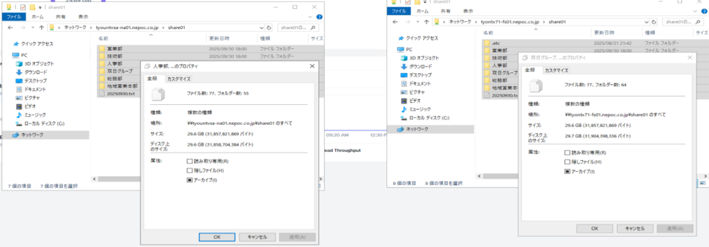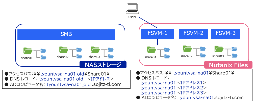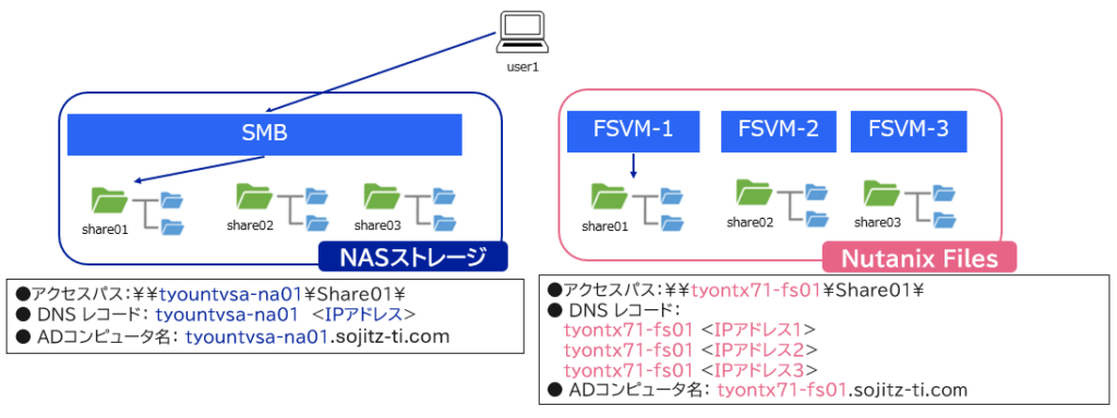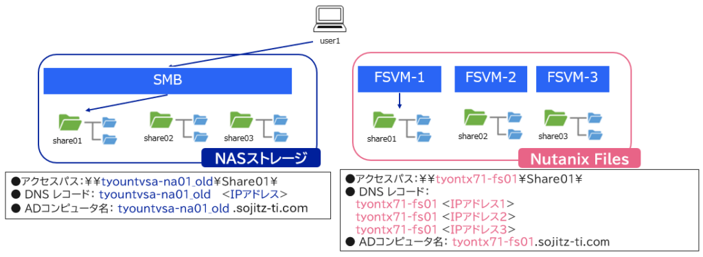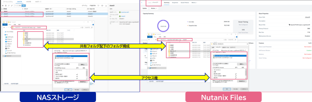 (左:移行元_NASストレージ、 右:移行先_Nutanix Files)