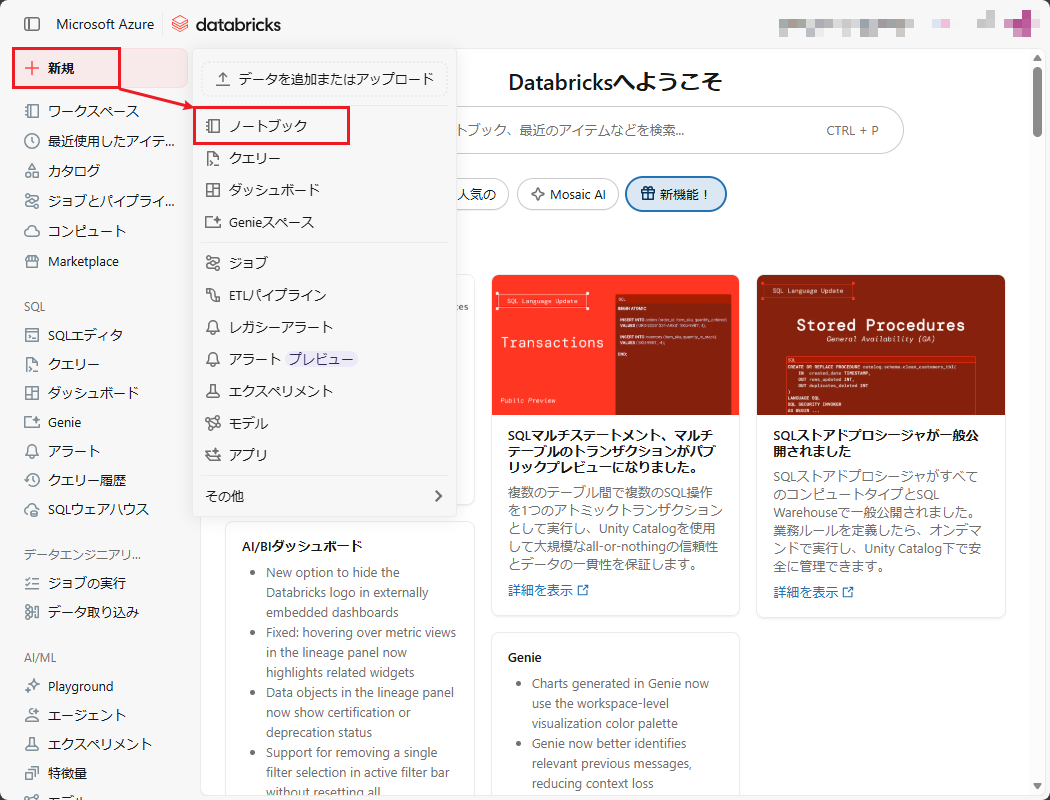 ②Azure Databricksポータル画面で、サイドバーを展開します。