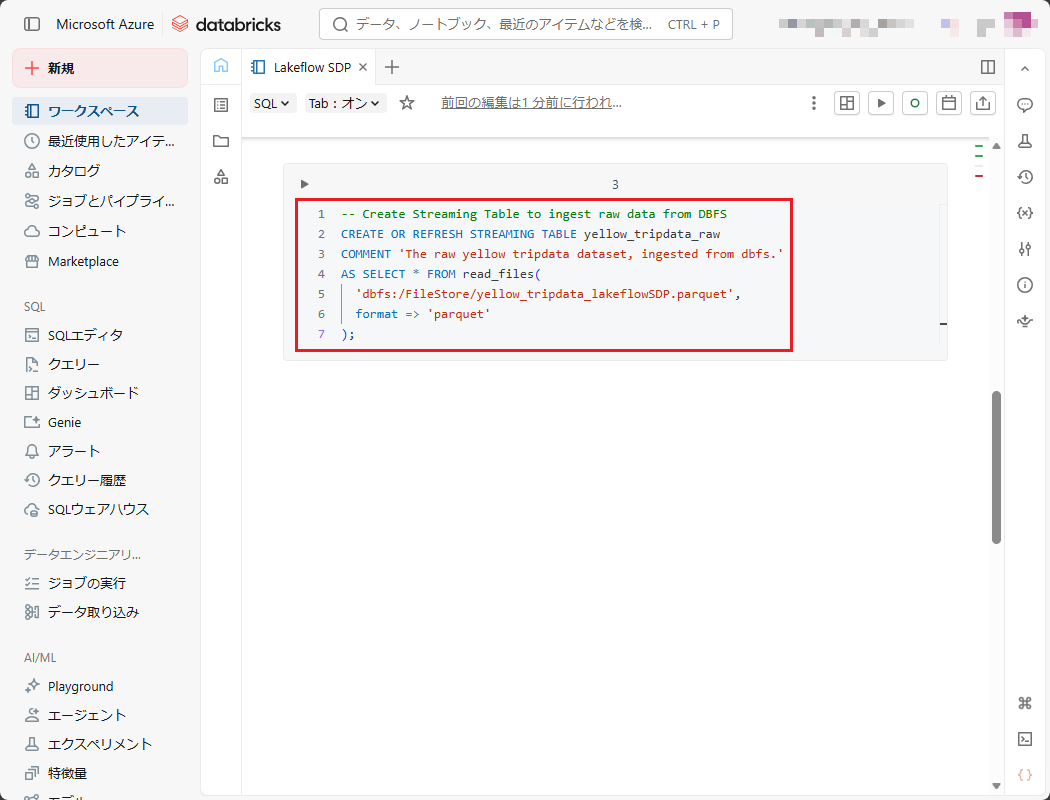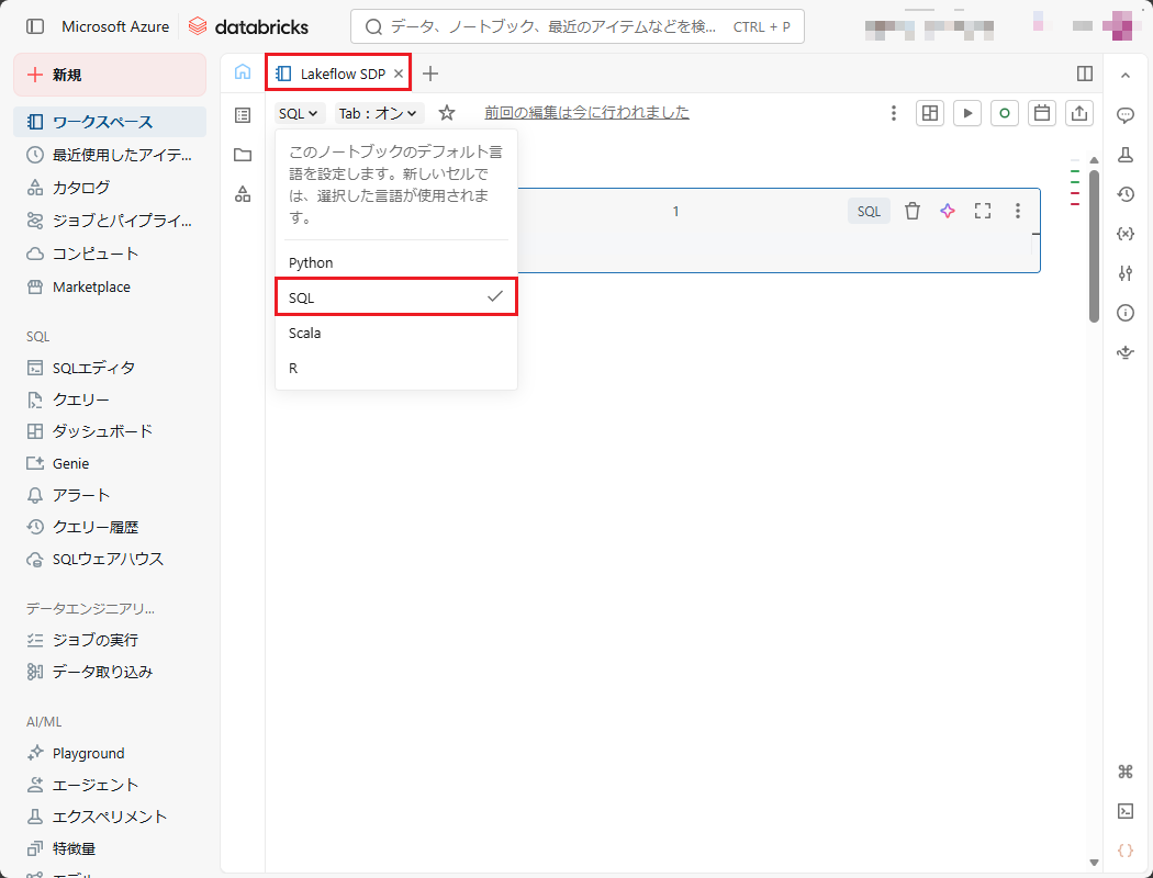 Notebookの名前を「Lakeflow SDP」に変更し、言語としてSQLを選択します。