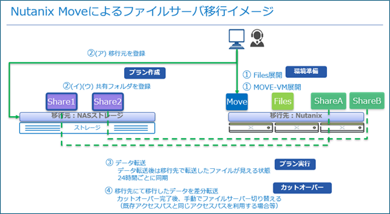Nutanix社は、VMwareからAHVへの移行を簡単に実現できる無償ツール「Nutanix Move(以降『Move』)」を提供しています。Moveは仮想マシンの移行に加えて、3rdパーティ製ファイルサーバ(NASストレージ)からNutanix Files(Nutanix社が提供するファイルサーバ。以降『Files』)への移行もスムーズに行えます。
