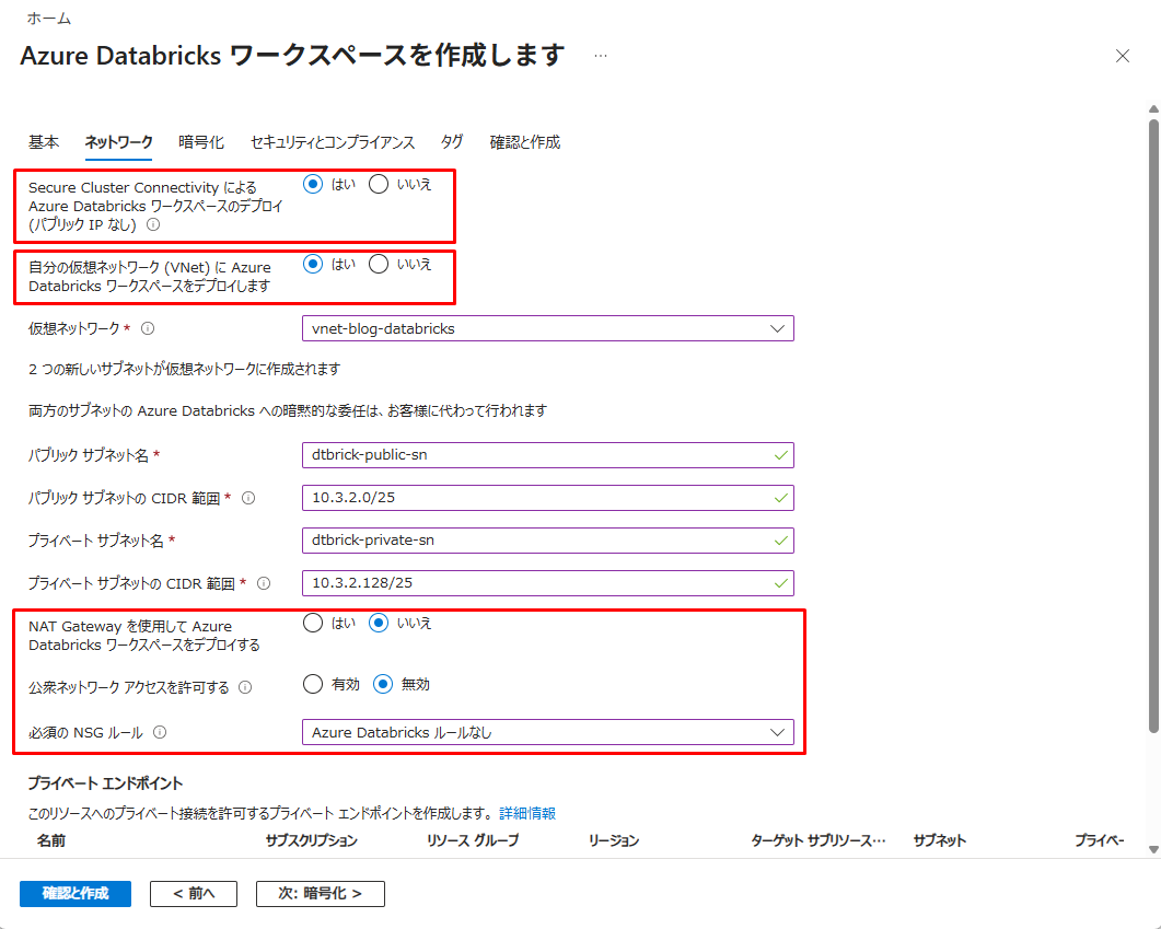 ・Azure DatabricksワークスペースでVnetインジェクションを実施できること。
