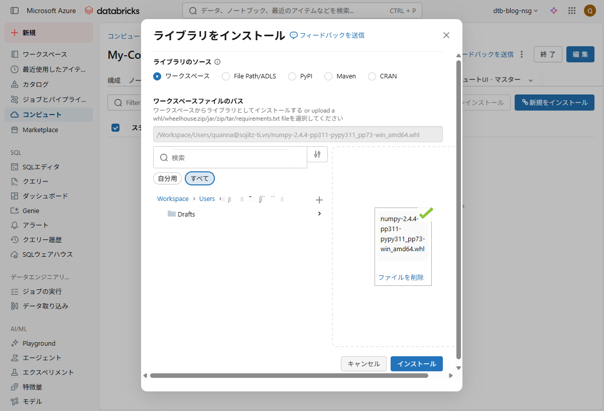 インターネットアウトバウンドを禁止したので、Client PCからインストールファイルをアップロードして、Python packageをインストールします。