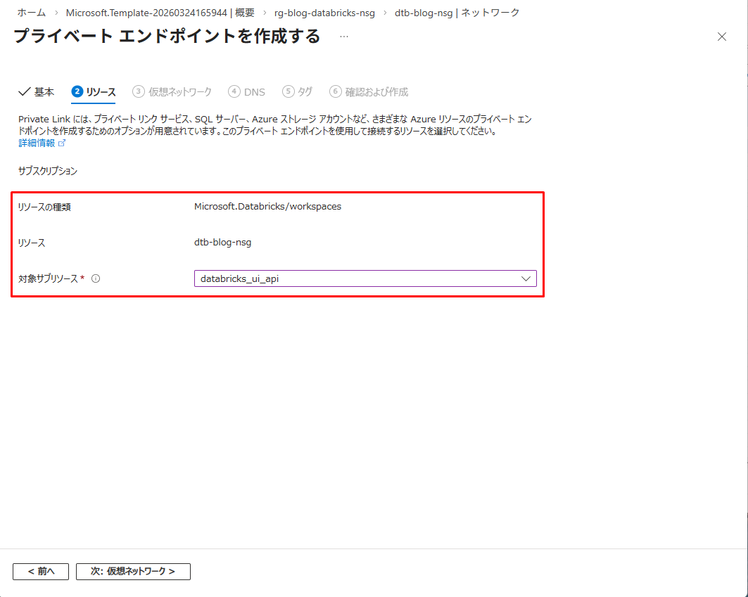 注意:該当のワークスペースを選択して、対象サブリソースにdatabricks_ui_apiを選択します。