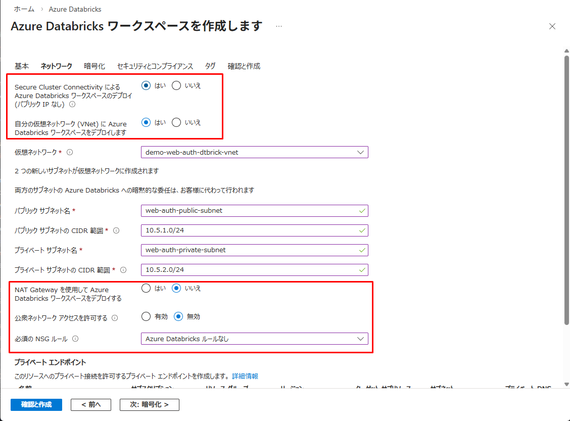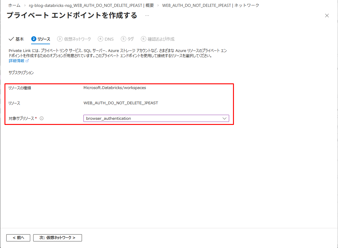 ※・ブラウザー認証プライベート エンドポイントはDatabricksのリージョン毎で共有される仕様で、プライベートエンドポイントをホストするワークスペースが削除された場合に依存する他のワークスペースのWeb認証が中断されてしまうため