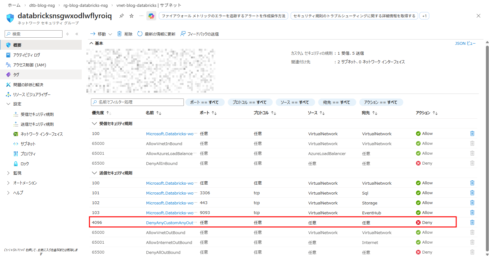 Databricksワークスペースのデプロイが成功した時に、パブリックサブネットとプライベートサブネットの両方が同じ NSG を共有します。